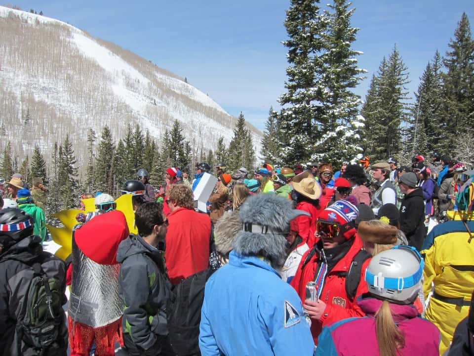 Clown Day at Park City Mountain with a big crowd of skiers and snowboarders at an on mountain party
